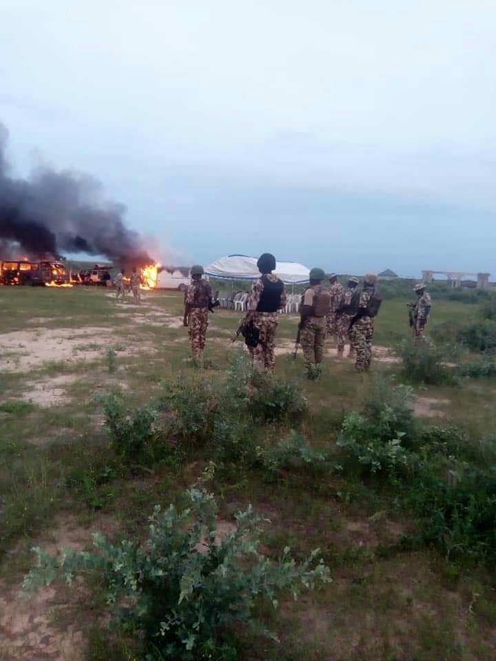 Kwamandan rukuni na biyu a hukumar sojoji dake karkashin shirin “Operation Lafiya Dole ( Commander Sector 2 Operation Lafiya Dole), Burgediya Janar Ibrahim Sallau Ali ya Jagoranci aikin kona Motocin safarar kifi da aka kama makare da kifiye a Geidam.